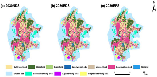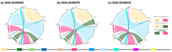 Under the EDS, the areas of cultivated land, grassland, unused land, and wetland decrease to different degrees; among them, the area of cultivated land decreases the most (11.06 km2), and the areas of woodland and construction land increase by 2.335 km2 and 10.444 km2, respectively. The areas of shellfish farming and integrated farming will show increasing trends, in which the shellfish farming area will increase the most (5.634 km2), and the unused sea area will decrease the most (−6.676 km2). Figure 6 shows that the increase in construction land will be caused mainly by the conversion of cultivated land, with a transfer area of 9.3267 km2. The decrease in the unused sea area is caused mainly by the increase in the area of shellfish farming, with a transfer area of 5.4315 km2.