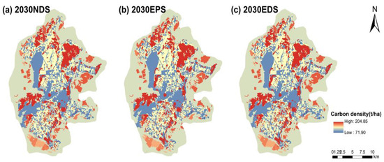 Spatial distribution of carbon density on Pingtan Island under three scenarios in 2030.