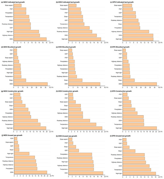 According to Figure 8, for cultivated land, we found that in island areas with poor natural conditions and poor land resources, low-altitude and flat places are often more easily cultivated [69,70]. Nighttime lighting, which reflects the spatial distribution of human activities, also indicates the occupation of and alteration in cultivated land by those activities [29]. Alterations in cultivated land areas are strongly influenced by nighttime lighting in the context of promoting economic development and urbanization [71,72]. However, in the scenario of promoting ecological protection and sustainable development on the island, the expansion of cultivated land is influenced mainly by the combination of the DEM and nighttime lighting. Changes in woodland area are affected mainly by elevation. Woodlands are located mainly in mountainous areas with high elevations and low population densities, which are less affected by human activities and thus favor woodland expansion [18]. In the case of construction land, nighttime lighting is the main factor indicating its expansion; increased nighttime lighting means increased human activity and a further expansion of urbanization in the island area [71]. Against the background of the gradually warming climate and rising sea level, the expansion of the sea area in the island area is strongly influenced by elevation [73]. The lower the elevation is, the greater the likelihood that the area will be affected by sea level rise. Under the EPS, the greatest indicator of the expansion of the unused sea area is nighttime lighting, as it reflects efforts to limit the detrimental impact of human activities on the island’s ecological environment and promote the sustainable development of the island [73]; more nighttime lighting indicates higher levels of human activities [71].