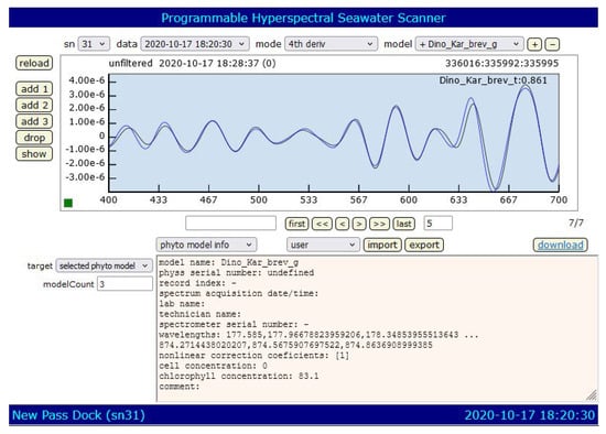At the core of the PHySS’s operational principle lies its reliance on the absorbance spectra derived from the seawater samples. This approach is protected under United States Patent No. US 7,236,248 B2, issued in 2007 [], underscoring the device’s proficiency in distinguishing and pinpointing phytoplankton varieties, especially the Karenia species. These species are of significant ecological interest due to their role in occasional HABs. The functionality of the PHySS is significantly enhanced by an intricate processing algorithm devised by researchers at Mote Marine Laboratory. As Hails et al. elaborated in 2009 [] that this algorithm scrutinizes the fourth derivative of the particulate absorbance spectrum from each sample. This advanced level of analysis allows for comparison against a reference spectrum of Karenia brevis, facilitating the accurate identification and categorization of this particular phytoplankton.