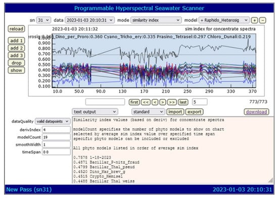 The Programmable Hyperspectral Seawater Scanner (PHySS) [] was employed for the precise identification and analysis of seawater samples using a Fourth-Derivative Spectral Similarity Index (SI). This study evaluates the correlation between the SI and direct phytoplankton cell counts, discussing the current limitations of the PHySS and proposing enhancements for future monitoring strategies.