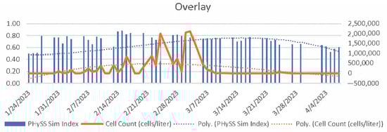 Figure 4 illustrates the temporal progression of SI values throughout the comprehensive 30-day sampling period undertaken. Each data point on this graph is aligned with specific temporal milestones, with the corresponding SI values plotted along the y-axis. This graphical representation is instrumental in illustrating the dynamic fluctuations of SI values over time, offering an intuitive insight into the trends and patterns that emerge from our dataset. The graph’s construction is designed to facilitate an immediate understanding of how the SI values, which reflect the spectral similarity of sampled water to the reference spectrum of Karenia brevis, evolve in response to environmental and biological variables. Notably, SI values of 0 appeared over the weekends when no physical cell counts were performed, highlighting periods without corresponding data for comparison. By tracking these changes, we can discern potential correlations between the presence of Karenia brevis and various environmental conditions or events within the sampling period.