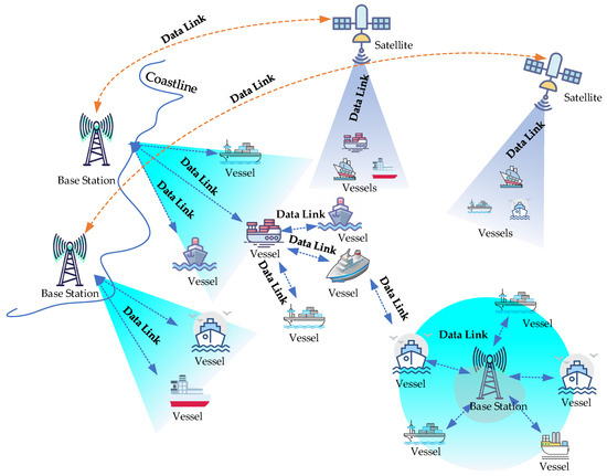 Nevertheless, notwithstanding the considerable potential of VDES to enhance the effectiveness of maritime communication, it also confronts certain drawbacks and challenges [5]. Currently, the maritime communication network mainly encompasses satellite-based maritime communication systems, land-based maritime communication systems, island-based maritime communication systems and other systems that respond to diverse service requirements. A schematic diagram of the maritime wireless communication system is presented in Figure 1 [6].