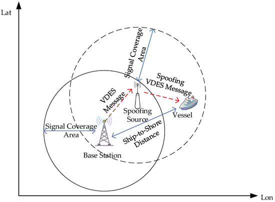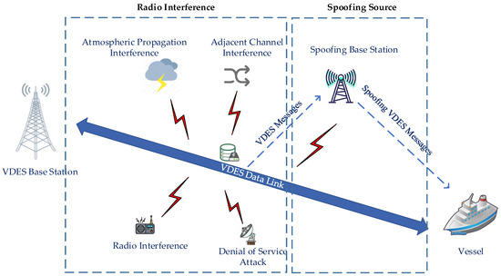 However, as each system is relatively independent and lacks unified resource management and operational coordination, the overall utilization efficiency is extremely low, which restricts the development of maritime communications. Realizing the effective system integration of the existing maritime communication system can facilitate the efficient operation of the maritime network system and provide an effective guarantee for the scope of network coverage, real-time information transmission and reliability. In recent years, as maritime data communication requirements have continuously evolved, AIS, originally designed for automatic ship identification and collision avoidance, has increasingly assumed the role of ship-to-shore data communication. Intelligent processing of AIS data is used to predict ship positions in real time and can assist in decision making, thus enhancing maritime transportation safety and efficiency [7,8]. The escalating communication demands placed on the AIS system within the VHF band have resulted in a highly congested frequency band. IALA has indicated that when AIS data link loads exceed 50%, it can give rise to severe problems such as information congestion, affecting navigation safety. The performance of the AIS system is directly influenced by factors such as link load. As the link load increases, the time slot multiplexing ratio rises, along with the time slot conflict rate. When the conflict rate reaches a certain level, the communication reliability of the system is compromised. The AIS system is of crucial importance for ensuring safe navigation, and its effectiveness is of paramount significance [9]. Moreover, the increasing demand for data exchange is a key driver that necessitates an upgrade of the AIS system. As the demand for maritime data communication keeps rising, designing and managing efficient wireless communication networks becomes indispensable [10,11]. To address AIS frequency band congestion, multi-band communication technologies can be utilized to optimize spectrum usage. Additionally, enhancing the network’s adaptive capabilities to monitor and adjust communication parameters in real time can help alleviate the risk of information blockages [12]. Furthermore, implementing a cloud-based management system that leverages big data analytics to optimize data flow and resource allocation can significantly enhance overall communication efficiency. Through these measures, the ultimate aim is to achieve a more secure and efficient maritime wireless communication network to meet the growing demand [13,14]. To alleviate the strain on AIS channels caused by this increased occupancy, VDES leverages the existing AIS infrastructure by introducing ASM and VDE to enhance data transmission capabilities comprehensively. The risk of AIS link overload necessitates the adoption of VDES, which offers improved data transmission rates and advanced protocols, as recommended in ITU-R M.2092-1. However, the increased complexity of VDES, particularly its Very-High-Frequency Data Link (VDL), makes it more susceptible to various issues. Consequently, diligent monitoring of the VDL is crucial to mitigate potential impacts and ensure the reliability and resilience of VDES operations [15]. Notably, on 14 December 2023, the “Guidelines for Integrity Monitoring of Very-High-Frequency Data Exchange System Data Links (G1181)”, led by China, were approved by the IALA Council and officially released [16]. These guidelines emphasize that the wireless nature of VDES introduces inherent vulnerabilities in its VDL, including factors such as radio interference and spoofing messages, as illustrated in Figure 2. Radio interference affecting the VDES data link includes co-channel interference from non-VDES services, adjacent channel interference from other maritime operations, and spurious emissions from high-power devices [17,18]. Additionally, interference in the VDES domain may stem from VDES base station slot collisions and atmospheric disturbances [19]. Such interference can compromise the capacity of VDES equipment to accurately demodulate signals, thus jeopardizing navigational safety by propagating errors in message transmission [20,21]. Furthermore, VDES base stations transmit various messages to facilitate navigation, including safety-related and hydro-meteorological messages. However, because the messages broadcast by VDES base stations lack encryption and the system does not incorporate an authentication mechanism [22], malicious actors can exploit genuine base station information for identity spoofing, spreading false information to vessels, misguiding navigational decisions, and endangering safety [23]. Consequently, if vulnerabilities compromise the VDES data link—leading to information loss, content errors, or the dissemination of false messages—the confidentiality, integrity, and availability of wireless communication are severely impacted. These vulnerabilities not only threaten the credibility and security of maritime communication but also create significant navigational safety risks. Therefore, to protect the authenticity and effectiveness of information disseminated by VDES base stations, proactive measures must be implemented to monitor vulnerabilities in the VDES data link, with a particular focus on ensuring the credibility of the data link [24].