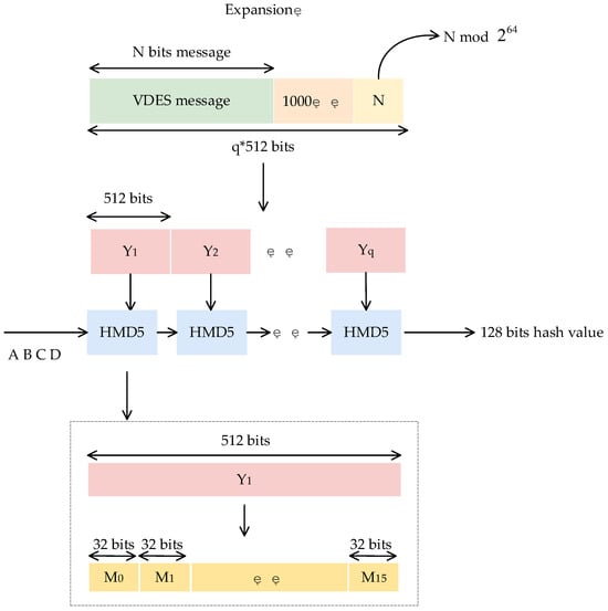 Initially, the data parsed from VDES messages undergo padding and segmentation by the MD5 algorithm. Subsequently, each block is subjected to iterative processing, ultimately yielding a 128-bit hash value for the VDES message. The specific computational process is outlined as follows: