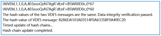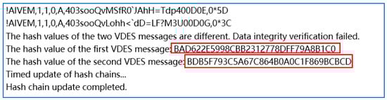 The simulation environments in Figure 5 employs the C# language within Visual Studio 2019 in Windows11 operating system environment. As depicted in Figure 5, the two message hash values highlighted by the red box differ, indicating that the messages did not pass the integrity check for message content. The discrepancies in the VDES messages are attributed to radio interference during the data link transmission process, resulting in transmission errors. This observation underscores the effectiveness of the MD5 algorithm in detecting data integrity issues within VDES messages.