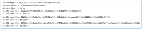 Moreover, within the realm of algorithmic evaluation, computational time serves as a pivotal benchmark. To further explore the processing efficiency advantage of the MD5 algorithm, this study compared the processing durations of the MD5 algorithm with three other prominent hashing algorithms, namely SHA-256, SHA-384 and SHA-512, in handling a single instance of the same VDES message. The VDES message under consideration for this comparative analysis is “!ABTDB,1,1,0,A,403t?j1vLohh<`JAhH=Tdp500D0G,0*6E”, with the outcomes of this verification detailed in Figure 7.