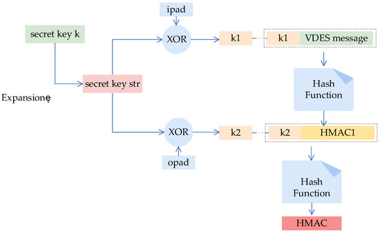 The VDES base station broadcasts link management messages in TDB format, which are automatically relayed by VDES ship stations using VEM statements. However, due to radio interference in the data link, the content of messages relayed by VDES ship stations and subsequently received again by the VDES base station may be tampered with, resulting in inconsistencies and posing safety risks to maritime navigation. Therefore, it is essential to verify the consistency of the content between the link management messages broadcast by the VDES base station in TDB format and the messages received again by the base station after being relayed. The Hash-based Message Authentication Code (HMAC) is a message authentication code that utilizes a hash function as part of its authentication algorithm. In wireless communication, the HMAC algorithm is employed to verify data integrity, playing a crucial role in safeguarding data security and preventing tampering. The HMAC algorithm generates HMAC values by combining a key with VDES messages. By comparing the HMAC value of the link management messages broadcast in TDB format with the HMAC value of the messages received via VEM statements, any discrepancies in the HMAC values indicate content tampering due to radio interference during transmission. Thus, comparing the HMAC values of TDB and VEM messages allows for the verification of data integrity in the transmission of messages between VDES base stations. The process flow diagram of the HMAC algorithm is illustrated in Figure 8.
