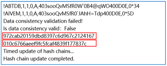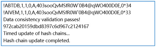 At a particular moment, if the message received again by the VDES base station after being relayed by a ship station is “!AIVEM,1,1,0,A,403sooQvMSfR0W`0B4@qWO400D0E,0*33”, the HMAC value for this message can be calculated using the HMAC algorithm to yield the results of the consistency check for message exchanges, as shown in Figure 10.