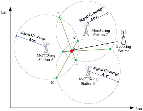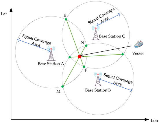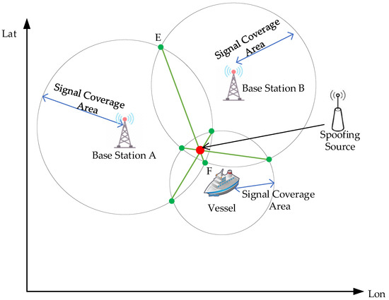 Upon detecting a spoofing source while monitoring the VDES data link, the VDES ship station, as known information, is used to locate the spoofing source based on the vessel position reported by the VDES shipborne terminal and the two base station positions received by the ship station within the tolerance range. By utilizing the positions of each monitoring station as circle centers with the coverage range of each station’s signal as the radius, similar pairwise circle intersections occur. Line EF denotes the common chord formed by the signal coverage circles of Base Stations A and B. Connecting the intersection points of any two circles yields three common chords that converge at a single point, indicating the location of the spoofing source. Therefore, this method accurately identifies the position of the spoofing source, as shown in Figure 13.