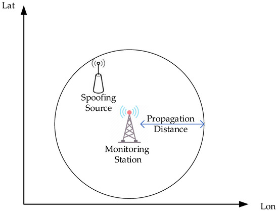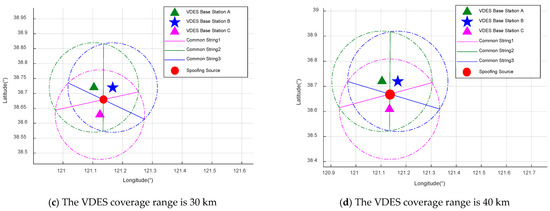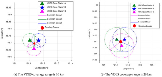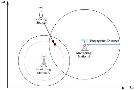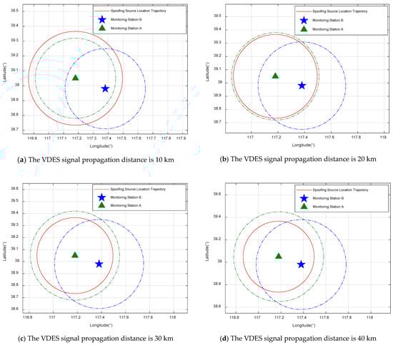 Subsequently, the distances between the VDES ship station and each VDES base station are calculated. Using a model for VHF signal propagation loss and received power under complex sea surface conditions, the propagation distances of the signals from each VDES base station are determined. The analysis then checks whether the ship-to-shore distance falls within the tolerance range of the propagation distance from each base station. If all distances are within this range, there is no indication of a spoofing source; however, if any propagation distance exceeds this range, it suggests the presence of a spoofing source, implying that one of the base station messages is being broadcast by an unauthorized source, as shown in Figure 12.