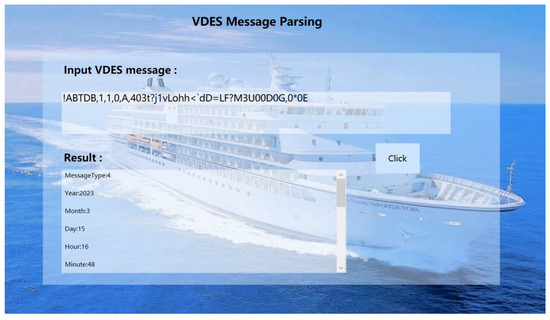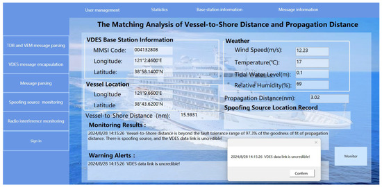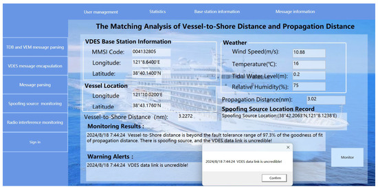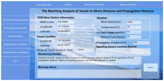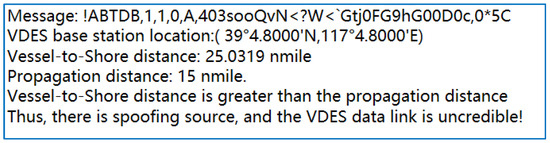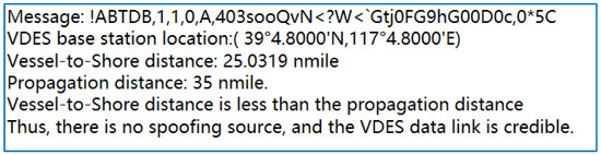 As shown in Figure 41, it was confirmed that the format of the message aligns with that stored in the VDES raw message database, enabling successful parsing. The verification of message format compliance was successful. Following this, a query to the AIS/VDES message distributed database revealed that all parameters of the message matched those of previously sent legitimate messages, validating the legitimacy of the message parameters. By utilizing the MD5 algorithm to compute the hash value of the received message and comparing it to the hash value of the legitimate message previously received by this base station, the computed results were consistent; both hashes were 9C97229193B791768895B670295ACD2F, confirming the integrity of the message content. Additionally, by applying the HMAC algorithm to compute the HMAC values of the TDB statement message and the VEM statement message separately, the results were also consistent, both being 972cab20159dbd8397c6d967c2124167, thereby passing the consistency check of the transmission and reception messages. In conclusion, at this point, the VDES messages were not vulnerable to threats of radio interference in the data link, allowing for subsequent spoofing source identification. The VDES signal coverage is calculated to be 27.1623 nautical miles based on sea surface meteorological conditions. Additionally, the distances between VDES monitoring station A and the ship station, calculated using Equation (9), is 2.9513 nautical miles, while the distance between VDES monitoring station B and the ship station is 3.2272 nautical miles. Both ship-to-shore distances are less than the VDES signal coverage range, indicating that the information broadcast by both monitoring stations can be received by the VDES ship station at this time. However, when considering the received power and the VDES signal propagation distance calculated using a complex VHF signal propagation loss model in the intricate sea surface environment, the distance between monitoring station A and the ship station falls within the tolerance range of 97.3%, fitting the propagation distance. Conversely, the distance between monitoring station B and the ship station exceeds this tolerance range, suggesting that the received VDES message does not originate from monitoring station B. This inference indicates the presence of a spoofing source in the VDES data link. The spoofing source localization algorithm determines the coordinates of the spoofing source to be (38°42.2063′ N, 121°8.1238′ E), validating the capability of the VDES data link integrity monitoring software system to successfully detect and locate spoofing sources within the data link.