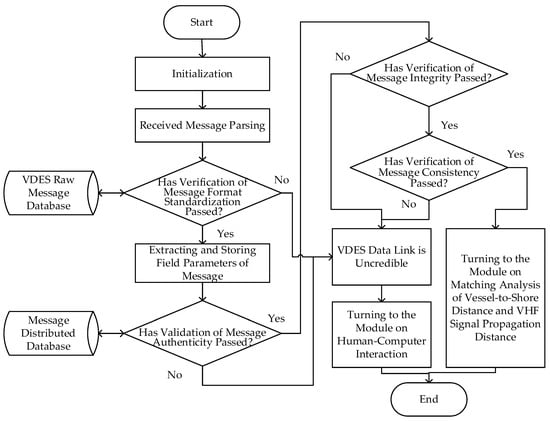 This paper examines two primary categories of vulnerability threats, as delineated in Figure 2, and proposes a collaborative monitoring strategy based on radio interference detection and spoofing source identification and localization to oversee the credibility status of data links within the outlined threat scenarios, as depicted in Figure 3. Radio interference threats targeting VDES data links originate from various sources, including atmospheric interference, adjacent channel interference, electromagnetic radiation interference, and pseudo-transmission interference from high-power devices. Detection of these interferences can be effectively carried out through several methodologies, including telegram format compliance verification, telegram parameter legitimacy verification, telegram content integrity verification, and verification of transmission and reception consistency. To elaborate, the process of telegram format compliance verification involves parsing received VDES messages. Successful parsing indicates compliance with the format; conversely, a failure to parse suggests the presence of radio interference, thereby compromising the credibility of the VDES data link. Additionally, telegram parameter legitimacy verification can utilize an AIS/VDES telegram distributed database, meticulously curated by the author’s research team in collaboration with relevant maritime administrative entities following extensive research and consultations. This database contains all legitimate telegrams previously dispatched by each shore station. Ensuring that the parameters within the VDES message align with those of legitimate telegrams from the specific shore station in the database is essential for passing the parameter legitimacy check; any misalignment signals potential radio interference, jeopardizing the credibility of the VDES data link. For a comprehensive understanding of the implementation methodologies related to these aspects, readers are referred to reference [36]. Furthermore, telegram content integrity verification employs the MD5 algorithm to assess the integrity of received VDES messages against legitimate telegrams stored in the original VDES telegram database. A match in the hash values of both messages indicates successful passage of the content integrity check; conversely, a mismatch signifies radio interference, thereby impacting the credibility of the VDES data link. VDES shore stations disseminate link management telegrams through TDB statements, which VDES ship stations then relay using VEM statements upon reception. After receiving this relayed message, VDES shore stations use the HMAC algorithm to validate the consistency between transmitted and received telegrams. If the HMAC values of both telegrams align, the transmission and reception consistency check is passed; any disparity indicates radio interference, casting doubt on the credibility of the VDES data link. Upon completing radio interference detection procedures, the VDES messages transition to the spoofing source identification and localization algorithm. Spoofing source interference targeting VDES data links originates from “Spoofing” base stations that threaten maritime safety by propagating false VDES messages to vessels within their signal coverage, often by misappropriating the Maritime Mobile Service Identity (MMSI) of genuine VDES shore stations. Detecting such interferences requires a comprehensive analysis of ship-to-shore distances and propagation distances to ascertain the presence of spoofing sources. VDES ship-based stations compute the ship-to-shore distance by comparing the vessel’s position, relayed by the VDES ship-based station, with the base station’s position, using a VHF signal propagation loss model and received power calculations to determine VDES signal propagation distances in complex maritime environments. Subsequent analysis evaluates whether the ship-to-shore distance falls within the acceptable propagation distance tolerance range. Any deviation beyond this range indicates a potential spoofing source, prompting further scrutiny through the spoofing source identification algorithm to pinpoint the position or range of the spoofing source. Conversely, compliance with the tolerance range affirms the absence of a spoofing source, thereby confirming the credibility of the VDES data link.