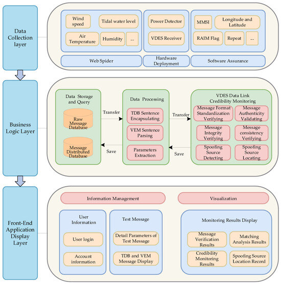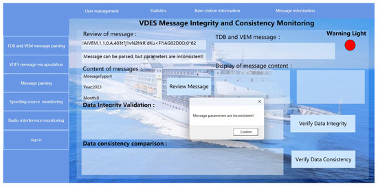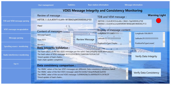 - To automatically monitor the credibility of the VDES data link and issue timely warnings of vulnerabilities to vessels or management centers, this study develops monitoring software based on a tripartite data architecture supported by a client/server (C/S) model, using the front-end interface to display the monitoring results, warning information, and related data visually, facilitating a direct understanding of the credibility of the VDES data link.