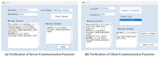 The simulation environments in Figure 10 employs the C# language within Visual Studio 2019 in Windows 11 operating system environment. Illustrated in Figure 10, the congruence of HMAC values between link management messages originating from the VDES base station via TDB statements and those relayed by VDES ship stations using VEM statements—subsequently re-captured by the base station—underscores a uniformity represented by the value 972cab20159dbd8397c6d967c2124167. This consistency serves as evidence that VDES communications endure unscathed amidst the challenges posed by wireless radio interference in the data link, a conclusion substantiated through meticulous assessments of message coherence. Consequently, this outcome affirms the efficacy of the HMAC algorithm in fortifying message integrity throughout VDES base station transmissions.
