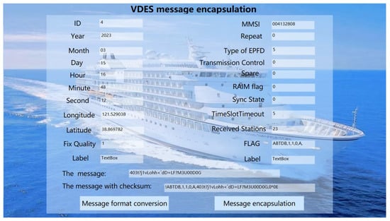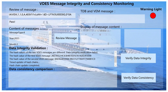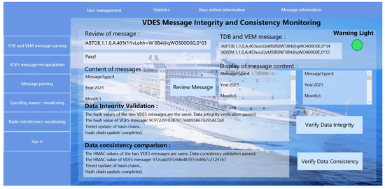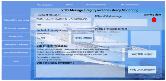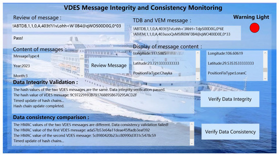 To corroborate the efficacy of the VDES message integrity validation technique reliant on the MD5 algorithm in overseeing the integrity of VDES message content, this section undertakes validation and scrutiny of the design methodology utilizing authentic link management messages received by the VDES base station. For instance, in an illustrative scenario, the VDES base station may receive a message such as “!AIVEM,1,1,0,A,403sooQvMSfR0`JAhH=Tdp400D0E,0*5D”, while the legitimate message sent by a ship station and received by the base station in the VDES original message database is “!AIVEM,1,1,0,A,403sooQvLohh<`dD=LF?M3U00D0G,0*3C”.