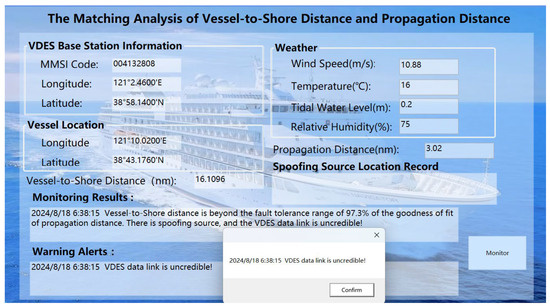 Building upon the completion of radio interference detection in the VDES data link, this section employs a method that matches ship-to-shore distance with propagation distance to validate the effectiveness of the VDES data link integrity monitoring system in detecting spoofing sources within the data link.