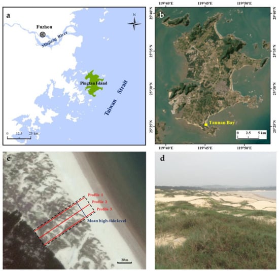 Observation area of coastal dunes in Tannan Bay, Pingtan Island: (a–c), landscape photo (d) taken in May 2016.