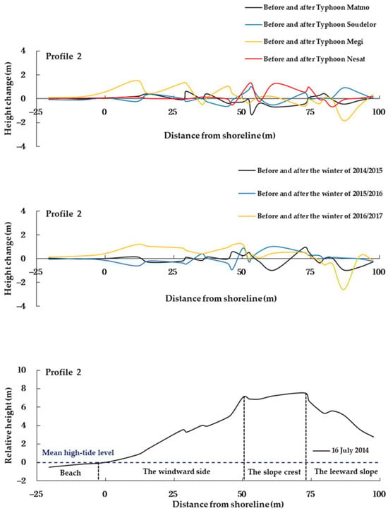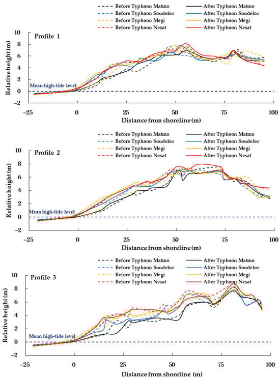 Height variation of observation profiles of the coastal dunes before and after typhoons.