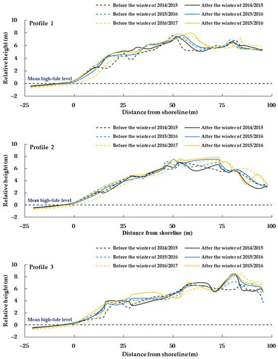 Height variation of observation profiles of the coastal dunes before and after winter monsoons.