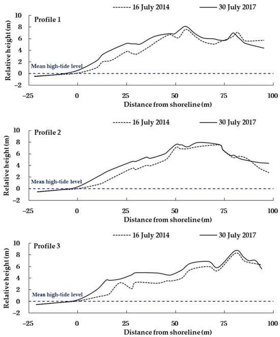 Height variations of observation profiles of the coastal dunes from 2014 to 2017.