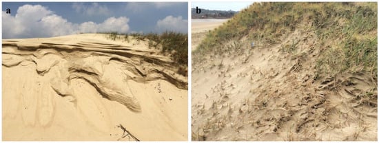 The windward slope base and midsection of the coastal dunes in Tannan Bay are particularly susceptible to sediment accumulation caused by typhoons and storm surges, leading to increases in their height. Wind erosion typically occurs beyond a certain dune height, particularly near the slope crest [14]. However, due to variations in microtopography and vegetation cover across the coastal dunes, the primary characteristics of the different parts of the coastal dune are the distribution of erosion and accumulation post-typhoon (Figure 5). The presence of Spinifex littoreus vegetation on the coastal dunes in Tannan Bay acts as a protective barrier, enhancing local moisture conditions, altering near-surface flow dynamics, and mitigating erosion during typhoon events [34]. Field observations indicate that the exposed dune slopes are more prone to wind or storm surge erosion under typhoon conditions (Figure 6a), whereas vegetated slopes predominantly experienced sediment deposition (Figure 6b).
