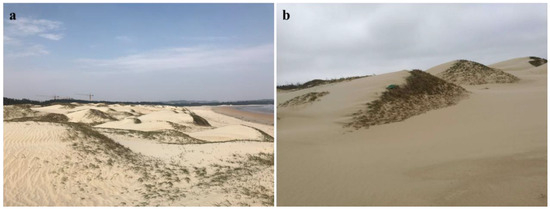 Coastal dunes serve as vital natural barriers in coastal regions, supporting significant biodiversity and contributing to the aesthetic value of tourist destinations [1,2,3]. Wind is the dynamic factor in the formation of coastal dunes; specifically, their development and movement are controlled by near-surface air flow and aeolian processes [4,5]. China’s coastal zone, a quintessential monsoon climate region, is profoundly influenced by the East Asian winter monsoon, experiencing frequent typhoon landfalls each year. This distinctive climatic setting imparts Chinese coastal dunes with both the common characteristics of global coastal dunes and unique features arising from their formation and evolution under the influence of typhoons and the East Asian winter monsoon [6]. Therefore, investigating the combined impact of typhoons and the winter monsoon on coastal dune morphology is essential for revealing the governing principles of their development and evolution. Such an investigation also provides a scientific foundation for accurately assessing regional characteristics, understanding the formation and evolution of coastal environments, and elucidating coastal sand geomorphological processes.