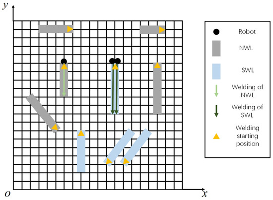 Consider that the coordinated ship-welding task in this paper is constructed on a grid-world Cartesian coordinate system with origin O, horizontal direction x, vertical direction y, and grid length . The coordinated ship-welding task is composed of n robots labeled by and m weld lines for ship building labeled by . In this task, n robots are required to weld all m weld lines with synchronous weld lines (SWLs) labeled by and normal weld lines (NWLs) labeled by . Each of the SWLs is required to be synchronously executed by a pair of robots, and each of the NWLs can be finished by one robot. The execution of welding is started from the welding starting point for the jth weld line.