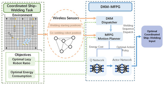 To solve the problem in Definition 1, the DKM-MFPG (dynamic Kuhn–Munkres model-free policy gradient) algorithm based on dispatching and reinforcement learning is proposed, where the DKM (dynamic Kuhn–Munkres) dispatcher uses the position information obtained by wireless sensors to dynamically design the welding sequence dispatch and ensures a low lazy robot ratio, while the MFPG (model-free policy gradient) optimal motion planner yields an energy-optimal planner for the coordinated ship-welding motion based on the dispatch results of the DKM. The DKM-MFPG framework is illustrated in Figure 3.