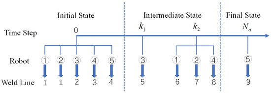 Case 2. In the case where there are fewer robots than weld lines, there are three kinds of possible states for dispatching: (1) Initial state at time step 0. At this state, all robots are dispatched with a weld line, which means no lazy robots exist and ; (2) Intermediate state between 0 and the last time step for dispatching. During this time, once a robot has finished its previously dispatched weld line, the DKM dispatcher instantly dispatches a new weld line for it. This means during this time, robots always have their dispatched weld lines; thus, no lazy robots exist and ; and (3) Final state when all weld lines have been dispatched at . As the last unwelded weld line has been dispatched to a robot, there is no weld line to be welded for robots just as in Case 1. To this end, lazy robots no longer exist from , and will remain 0 from now on. An example of the DKM dispatcher for this procedure can be found in Figure 4, where five robots and nine weld lines including a SWL labeled by 1 are dispatched, and the robots are all dispatched to a weld line until the final state with the lazy robot ratio equal to 0.