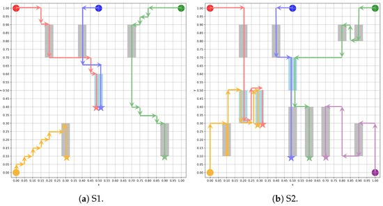 - Variant number of robots and weld lines.The number of robots and weld lines is the most important key point for affecting the performance of the proposed algorithm. Note that in the case of the number of robots larger than that of the weld lines, the dispatch can be easily determined by calculating the task accomplishment time in one step with a deterministic lazy robot ratio, which can be neglected. To comprehensively verify the performance of algorithms, two cases are considered: (I) the small scene case where the numbers of robots and weld lines are both small, e.g., S1; (II) the number of robots is smaller than that of the weld lines, e.g., S2–S5, where more than 10 weld lines are set since 10 weld lines cover at least 20 grids occupying most of the area of the grid world with . The comparison between S1 and S2–S5 is given to test the performance associated with the variant robot number, and at the same time, the comparisons between S1, S2 and S3, S4 and S5 are given to test the effectiveness under the variant number of weld lines.