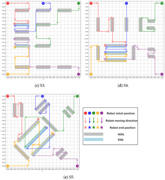 Trajectories of robots for S1–S5 under DKM-MFPG.