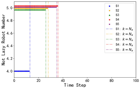 Number of non-lazy robots for S1–S5 under DKM-MFPG.