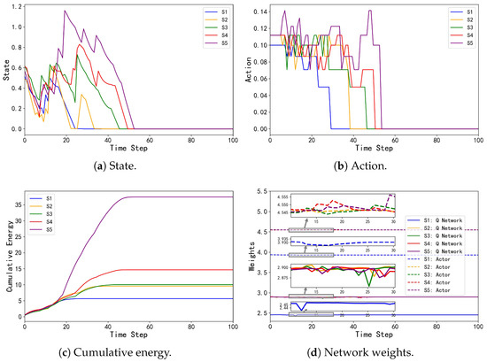 The robot motion trajectories for S1–S5 are plotted in Figure 5, and the results show that the robots successfully complete the welding of all weld lines in these scenarios under the DKM-MFPG algorithm. From Figure 6, it can be seen that the number of non-lazy robots equals the initial setting number of robots in each scenario until the last dispatched time step in all scenarios, which implies that the lazy robot ratio is always 0 and the optimization objective of the lazy robot ratio in (7) as well as Proposition 1 is validated. The curves of state, action, cumulative energy values, and weights of the network for all scenarios under the DKM-MFPG algorithm are plotted in Figure 7. According to the simulation result in Figure 7, the curves of Q-network weights remain unchanged and the energy cost curves also plateau simultaneously, which validates the accomplishment of the desired training performance. It can be seen that the above curves converge gradually in all the scenarios, which verifies the conclusion of Proposition 2 that the motion energy optimization objective (8) of coordinated ship welding is accomplished. Therefore, combining the above results, as stated in Theorem 1, DKM-MFPG can effectively complete the coordinated ship-welding task problem in Definition 1.