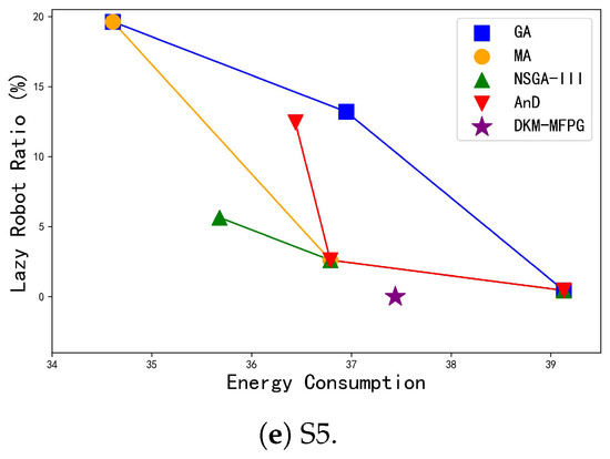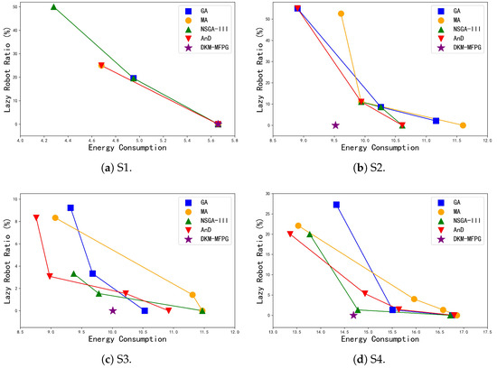 The numerical simulation results of the Pareto front of all methods under S1–S5 are given in Figure 8, and the average objective values calculated by the solutions of the Pareto front are shown in Table 2. It is noted that the diverse solutions of single-objective optimization methods are obtained by tuning different sets of weights for calculating the sum of the two objectives as the objective/fitness function, and the non-dominated solutions can then be picked out just like the Pareto front obtained by the multi-objective optimization methods. DKM-MFPG only has one certain solution due to the fact that the DKM dispatcher has determined the minimal lazy robot ratio dispatch; meanwhile, MFPG directly drives robots to reach the corresponding path with optimal energy. The values of the C-metric and the execution time are given in Table 3 and Table 4, respectively.