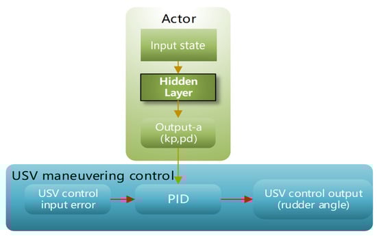 Figure 4 illustrated the relationship between the Actor network and USV motion controller. During training in the simulation system, the Actor outputs actions based on the input state through its neural network. These actions, representing PID control parameters, are utilized for USV motion control. The control deviation of the USV is used as input to obtain the USV control output variables, such as steering actions in heading control. Consequently, the USV executes steering actions, which are resolved through the rudder force model in the simulation environment, resulting in the USV’s subsequent motion posture.