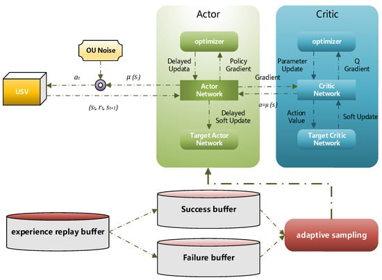 The tracking control process of USVs is a time-sequential decision-making problem characterized by MDPs. Thus, a USV can be regarded as an agent, with its motion control expressed in the form of . Herein, the details are as follows: