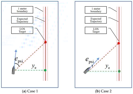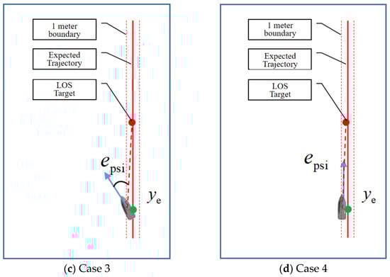 , : Here, the lateral deviation receives a minor negative reward (close to 0), while the heading angle deviation incurs a significant negative reward (on the order of −0.1). During training, actions yielding nearly 0 rewards are emphasized, guiding the USV to adjust its heading angle toward the LOS target to reduce the heading angle deviation. However, due to the inertia of USV motion and the narrow 1 m reward boundary for lateral deviation, if the heading angle deviation is substantial, the USV might overshoot the 1 m boundary during adjustment, resulting in oscillation around the tracking trajectory. To avoid this, the USV should not have excessive heading angle deviation when entering this scenario.