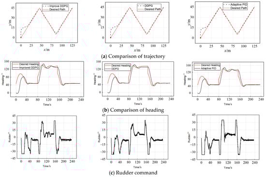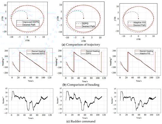Two key practical insights emerge from this work: First, the desired trajectory must align with the USV’s maneuvering limits. Trajectory points that exceed the USV’s steering capabilities, especially under full rudder conditions, will render the target trajectory unattainable in the presence of external disturbances. This not only compromises tracking performance but also hinders the Reinforcement Learning process. Second, while improving tracking accuracy, setting excessively small thresholds for error in the reward function can lead to instability in the neural network. Lowering the static error threshold makes successful experiences more difficult to achieve, thereby slowing the agent’s learning rate and significantly increasing the training time.
