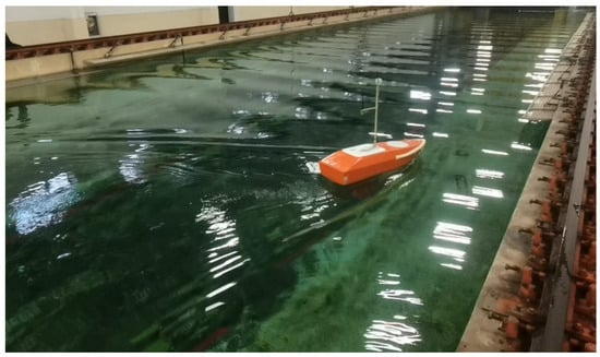 The experiment involved six irregular trajectory points. Initially, the propeller speed was adjusted in still water to achieve a USV speed of 0.8 [m/s], corresponding to a Froude number of 0.21. The USV’s heading was adjusted based on its real-time position relative to the first target point of the trajectory. Once the wave-making machine established a stable waveform with the desired amplitude and wavelength, intelligent control was activated on the host computer. The USV dynamically adjusted its rudder angle according to the algorithm, ensuring movement along the trajectory points. The aforementioned method was used to measure and record the motion data of the USV. The experimental process is depicted in