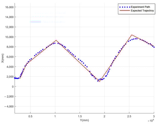 The experiment demonstrated that, despite wave disturbances, the USV effectively tracked all trajectory points with a smooth path, achieving a maximum trajectory error of approximately 200 [mm]. This error is small and is primarily attributed to deviations in trajectory point acquisition caused by the UWB positioning accuracy and the resulting control deviations. Under the current hardware conditions and operating modes, the positioning accuracy was optimized using filtering techniques; however, it is still affected by equipment precision, UWB positioning methods, and electromagnetic interference from water waves and metal tracks in the tank. Despite these challenges, the experiment and error analysis indicate that the intelligent matching technique for control parameters based on the proposed method achieves an excellent control accuracy under existing conditions.