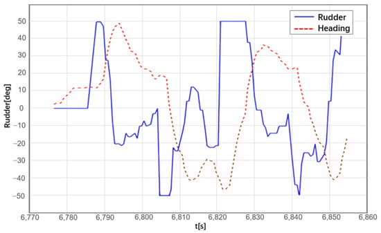 Figure 14 illustrates the real-time feedback of the rudder angle and the measured heading angle during the experiment. The changes in heading reveal five major trend adjustments required for path tracking, corresponding to the five segments in the actual trajectory. The heading changes were smooth, with a maximum rudder angle of 50 degrees at sharp turns along the target trajectory. The adaptive control yielded favorable results.
