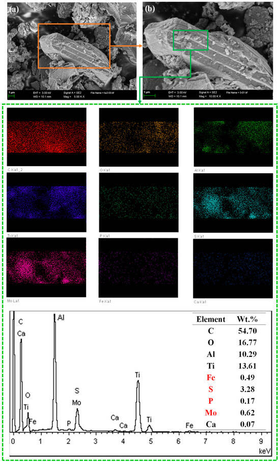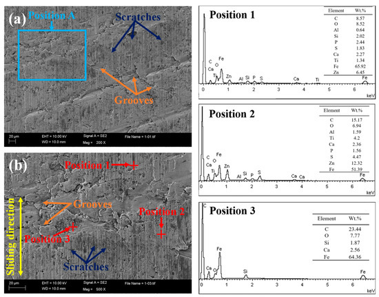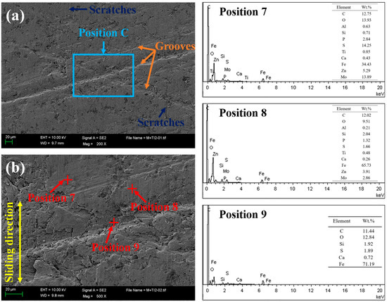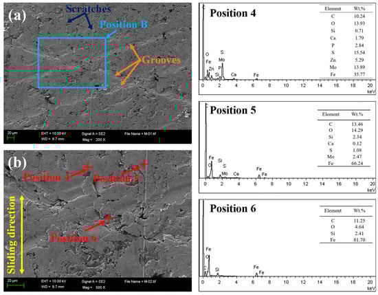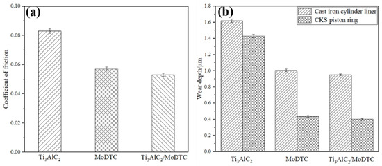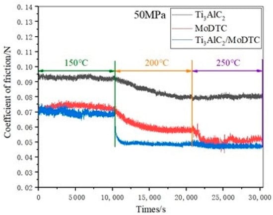 3.1. Friction and Wear Performance of Ti3AlC2, MoDTC and Ti3AlC2/MoDTC Composite Additives