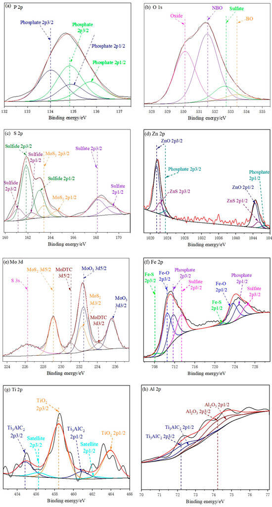 3.3. XPS Study of the Tribofilm on the Surface of the Worn Cast Iron Cylinder Liner Using the Ti3AlC2/MoDTC Composite Additive