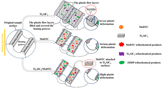 3.4. Failure Mechanism Analysis for Ti3AlC2, MoDTC and Ti3AlC2/MoDTC Composite Additives