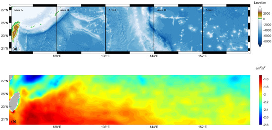 Significant differences exist in the generation and evolution of mesoscale eddies across various regions, largely due to the unique topography and water dynamics of each ocean area. The North Pacific Subtropical Countercurrent (STCC) region, a narrow eastward jet on the equatorial side of a subtropical gyre, is one of the hotspots for mesoscale activity in the northwestern Pacific Ocean [15]. Figure 1a shows the topographies of the STCC region (20°–28° N, 120°–160° E) on the basis of the ETOPO1 dataset. For follow-up research on the three-dimensional structure of eddies, the region is divided into five equal-sized areas (Area A, Area B, Area C, Area D, Area E), as illustrated in the accompanying figure. Previous studies of oceanic mesoscale eddies indicate that the STCC region, along with the Kuroshio Extension, exhibits stronger eddy kinetic energy (EKE) compared to other regions in the northwestern Pacific Ocean [16]. The spatial distribution of eddy kinetic energy (EKE) in the STCC region, based on sea surface height data provided by AVISO’s satellite altimetry from January 2007 to December 2014, is presented in Figure 1b. To enhance the visual representation, we plotted the base-10 logarithm of the eddy kinetic energy (EKE).