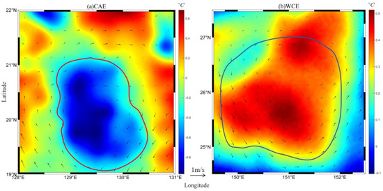 Example cases of (a) cold anticyclonic eddy and (b) warm cyclonic eddy detected from the combination of SSHA and SSTA maps provided by satellite observation. The red (blue) contour line depicts the boundary of the CAE (WCE) case. Arrows and shading represent the surface geostrophic currents and temperature anomalies after band-pass filtering, respectively.