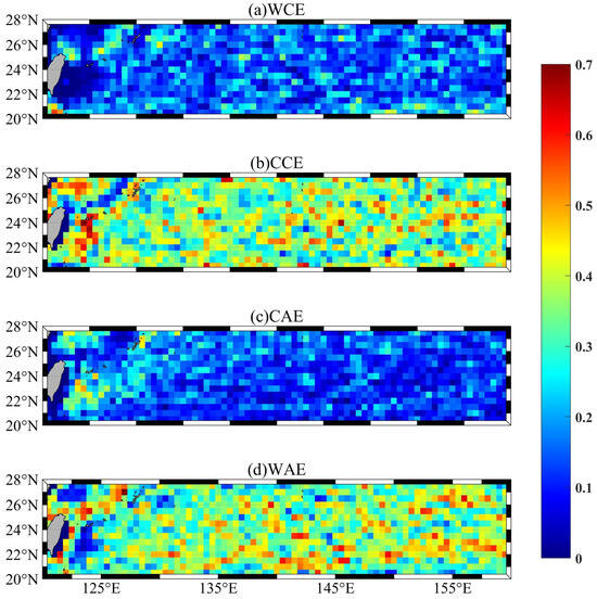 Figure 3 shows the occurrence frequency of four types of mesoscale eddies (the spatial distribution of two types of normal eddies, namely CCEs and WAEs, are also plotted for comparison) in the STCC region. Occurrence frequency is defined as the proportions of each type of eddy number to the total number of eddies in a single 0.5° × 0.5° bin. It can obviously be observed that two types of normal eddies (CCEs and WAEs) are patchily distributed in Areas B–E and occur relatively more frequently in Area A. Seafloor topography and underwater bathymetry distribution near Taiwan island might be one possible reason for the regional difference. The northeastern part of Area A is abundant in WAEs, whereas there exists a quantity of CCEs in the southern and northwestern pieces of Area A. Meanwhile, as shown in subgraph a, WCEs are sporadically distributed in the study area, and are a little bit more abundant in the southwestern part of Area A and the north segment of Areas A and B.