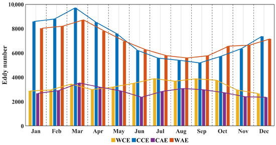 Figure 4 shows the monthly distribution of the number of abnormal and normal eddies in the STCC region. The variation trend of WCEs and CAEs is relatively smoother than WAEs and CCEs. The number of WCEs is characterized by a greater number from July to October (largest in July with 3888 WCEs) and a smaller number in winter and spring. Meanwhile, an inconspicuous bimodal distribution might depict the monthly variation of the numbers of CAEs, which occur less frequently in June (with 2359 CAEs) and are more active in spring and autumn. As for the variation trend of two types of normal eddies, CCEs and WAEs both tend to occur infrequently from July to September. The minimum number of CCEs and WAEs appear in September (5183) and August (5591), respectively. And, there exist more CCEs and WAEs from January to April, with the maximum number of CCEs (WAEs) being 9714 (8722) in March.