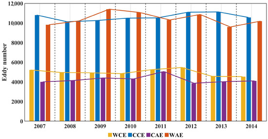 In Figure 5, the annual distribution of four types of eddies is presented in the same way as Figure 4. It can be seen that the annual volatility of the eddy number is smaller than the monthly counterpart. The largest numbers of warm cyclonic eddies (WCEs), cold cyclonic eddies (CCEs), cold anticyclonic eddies (CAEs), and warm anticyclonic eddies (WAEs) occurred in 2012 (5467 WCEs), 2013 (11,134 CCEs), 2011 (5056 CAEs), and 2009 (11,409 WAEs), respectively. Conversely, the lowest counts for these four types of eddies were recorded in 2014 (4533 WCEs), 2008 (10,131 CCEs), 2012 (3865 CAEs), and 2013 (9597 WAEs). The results of the annual analysis indicate that the variations in the numbers of abnormal and normal eddies within the STCC region are not significant during the study period.